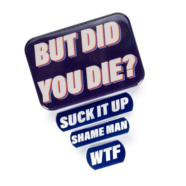 Our new streamline gift tin houses 30 excellent quality plasters and asks the question “but did you die?” the plasters are printed with the words Suck It Up, Shame Man and WTF. They make for a useful gift and a humorous addition to your first aid kit.
