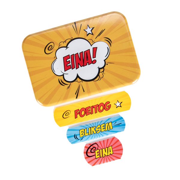 Our new streamline gift tin houses 30 excellent quality plasters printed with cool pop art and the words Foeitog, Bliksem and Eina. They make a useful gift and a humorous addition to your first aid kit.
