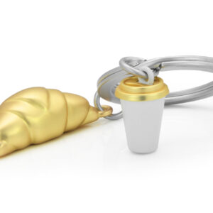 This premium quality keyring boasts a matt gold croissant and white take away coffee cup.