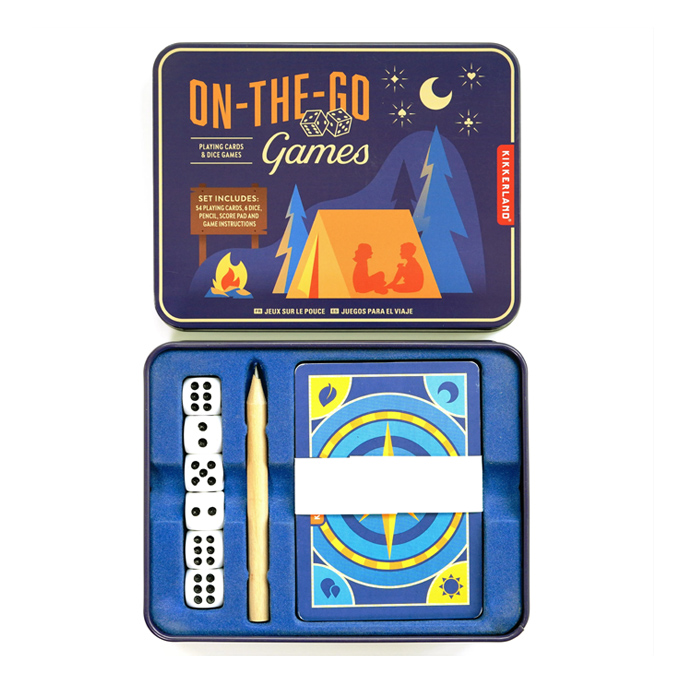 Outdoor Game Tin kit. Comes with a deck of cards with compass design, (6) dice, pencil, score cards, and instruction booklet for game ideas.