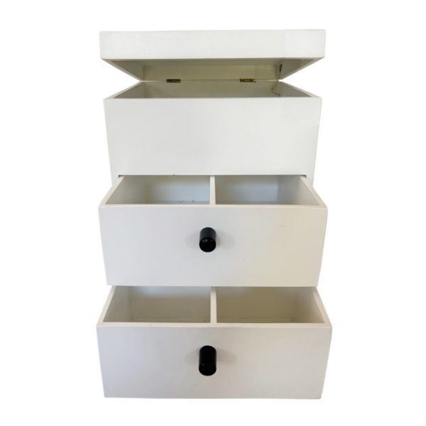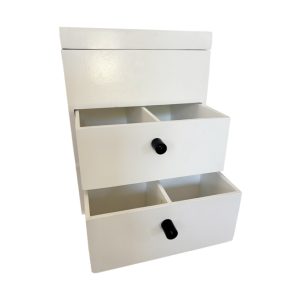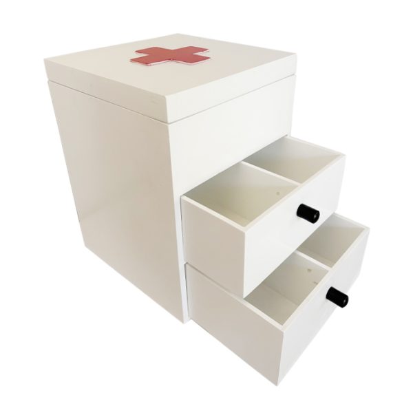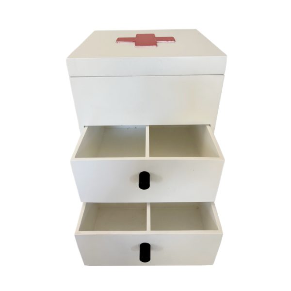 You will notice the lid is on hinges and lifts up to reveal a space for equipment like masks, pumps and tubes etc. The bottom consists of two drawers that feature divisions of varying size large enough to keep bottles and boxes of medication in order. No matter the condition, but also great for everyday household first aid kits, you will find that Simon’s Box brings order and peace of mind to a usually chaotic and stressful storage situation.
