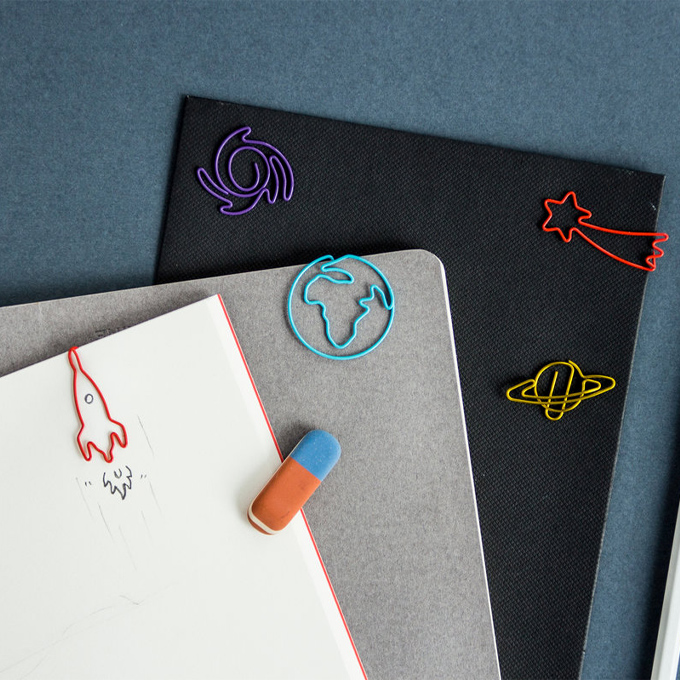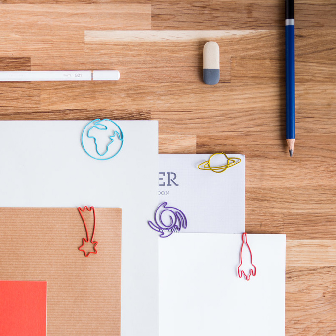 This selection of coloured space themed clips are ideal for any astronomical enthusiast. Made of metal and colour coated making this great for keeping all your paper work organised. Consisting of a Rocket, Earth, Saturn, Galaxy, and Shooting Star design.