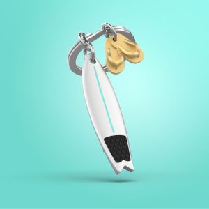 This quality keyring boasts a surfboard and gold slops charm. It is manufactured from Zinc Alloy and coated with Matt Chrome, Shiny Bullet, Black Silicone and Pearl Gold Plate.